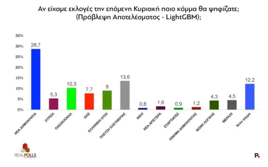 Στο 28,7% , με προβάδισμα 15,1 μονάδων από την Πλεύση Ελευθερίας που επέστρεψε στην 2η θέση, μέτρησε η Real Polls την εκτίμηση ψήφου για τη Νέα Δημοκρατία, στη δημοσκόπηση που παρουσιάστηκε από το protagon.gr. Τα συγκεκριμένο ποσοστό είναι πάνω από την επίδοση των ευρωεκλογών του Ιουνίου 2024 (28,31%), αλλά κάτω από τα ποσοστά της ΝΔ στις δίδυμες βουλευτικές εκλογές του 2023. Είναι χαρακτηριστικό ότι πρόκειται για την καλύτερη επίδοση του κυβερνώντος κόμματος εδώ και έξι μήνες.