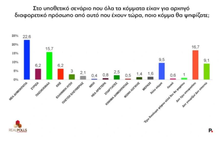 Η έρευνα της RealPolls μετρά, ως γνωστόν, και τις απαντήσεις για την πρόθεση ψήφου στο υποθετικό σενάριο που όλα τα κόμμα είχαν διαφορετικό αρχηγό. Η ΝΔ χωρίς τον Κυριάκο Μητσοτάκη υποχωρεί στο 22,6%, ενώ το ΠΑΣΟΚ-ΚΙΝΑΛ χωρίς τον Νίκο Ανδρουλάκη εκτινάσσεται από το 7,8% στο 15,7%. Κόμματα αρχηγικά, όπως η Πλεύση Ελευθερίας και η Ελληνική Λύση, βλέπουν τα ποσοστά τους να εξαερώνονται.