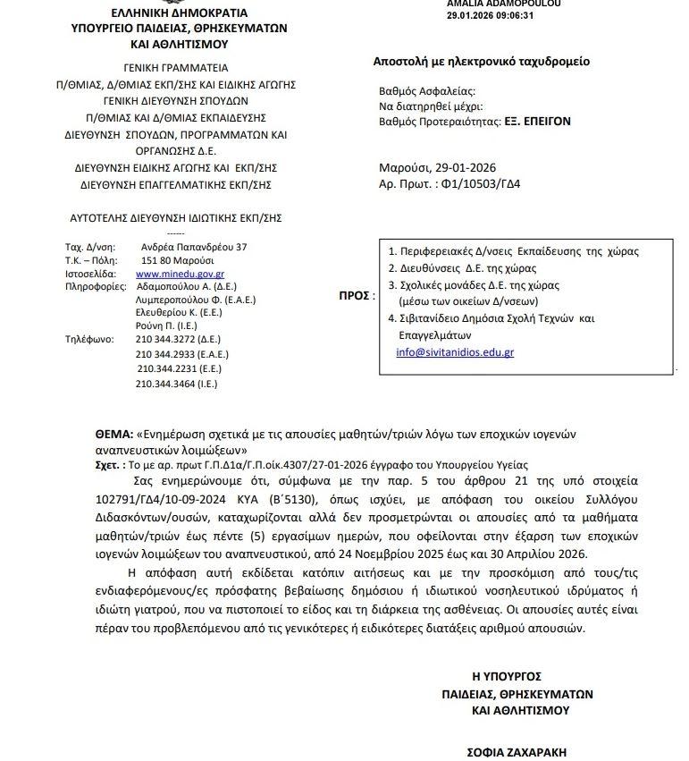 Το Υπουργείο Παιδείας, Θρησκευμάτων και Αθλητισμού, προκειμένου να συμβάλλει στον περιορισμό της μετάδοσης των αναπνευστικών λοιμώξεων και της προστασίας της δημόσιας υγείας, απέστειλε οδηγία στα σχολεία όλης της χώρας, στη βάση εισήγησης του Υπουργείου Υγείας, η οποία λαμβάνει υπόψη τα στοιχεία του ΕΟΔΥ που προκύπτουν από: