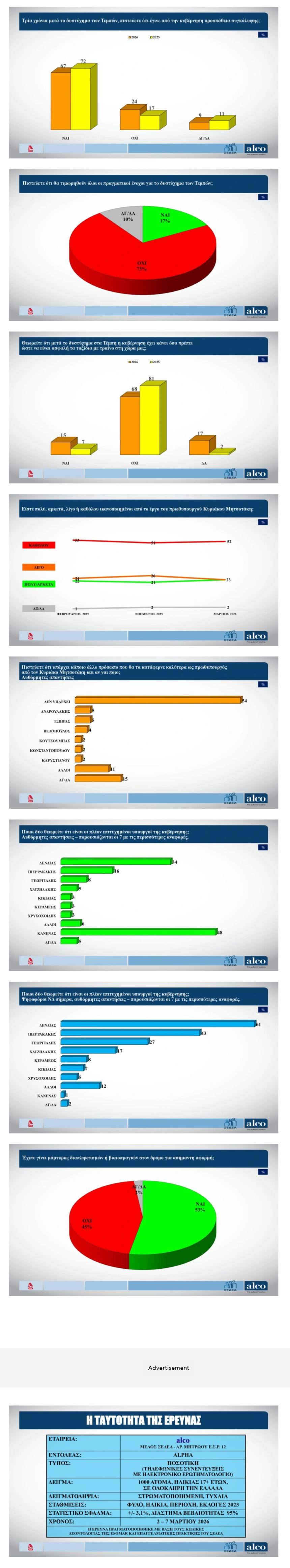 Ενδιαφέρον παρουσιάζουν οι απαντήσεις σχετικά με την τραγωδία των Τεμπών: Μειώνεται, αλλά παραμένει σε πολύ ψηλά επίπεδα (από το 72% στο 67%) το ποσοστό εκείνων που πιστεύουν ότι έγινε συγκάλυψη, ενώ το 73% δηλώνει ότι δεν θα τιμωρηθούν οι πραγματικοί ένοχοι. Υπερδιπλασιάζεται, αλλά παραμένει σε χαμηλά επίπεδα (από το 7% στο 15%) το ποσοστό εκείνων που λένε ότι η η κυβέρνηση έχει κάνει όσα πρέπει ώστε να είναι ασφαλή τα τρένα.