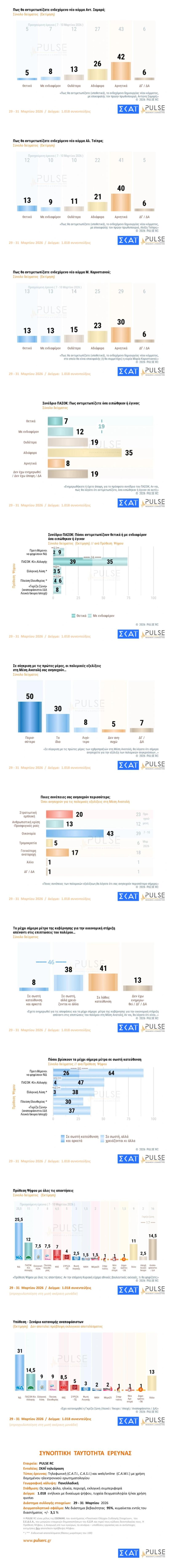 Η Pulse δίνει ελαφρά άνοδο μίας μονάδας στην πρόθεση ψήφου για το ΠΑΣΟΚ μετά το συνέδριό του, για το οποίο πάντως μόνον ένα 19% του συνόλου της κοινής γνώμης αναφέρει ότι το είδε «θετικά» ή «με ενδιαφέρον». Η έρευνα βγάζει μία επτακομματική Βουλή με τη Φωνή Λογικής να κερδίζει οριακά με 3% το εισιτήριο για το κοινοβούλιο, ενώ Νίκη, ΜεΡΑ25, Νέα Αριστερά και κόμμα Κασσελάκη να μένουν καθαρά εκτός. Από τα υπόλοιπα κόμματα ο ΣΥΡΙΖΑ χάνει μία ολόκληρη μονάδα και πέφτει στο 4% στην πρόθεση ψήφου, η Πλεύση χάνει επίσης μισή μονάδα και ισοβαθμεί στην τρίτη θέση με 7,5% με την Πλεύση Ελευθερίας, που κερδίζει μισή μονάδα. Οριακά κέρδη μισής μονάδας εμφανίζει και το ΚΚΕ.