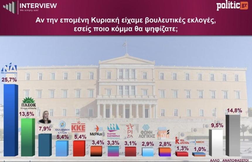 Πιο συγκεκριμένα, σύμφωνα με τη δημοσκόπηση της Interview για λογαριασμό της Politic, στην πρόθεση ψήφου η Νέα Δημοκρατία συγκεντρώνει 25,7%, καταγράφοντας απώλειες σε σχέση με το 28,7% του Μαρτίου. Το ΠΑΣΟΚ ακολουθεί με 13,5%, διατηρώντας ουσιαστικά αμετάβλητη τη δύναμή του (13,9% τον προηγούμενο μήνα), ενώ το κόμμα της Καρυστιανού – μετά τη δήλωση πρόθεσης καθόδου στις εκλογές – καταγράφεται για πρώτη φορά με 7,9%, καταλαμβάνοντας την τρίτη θέση.