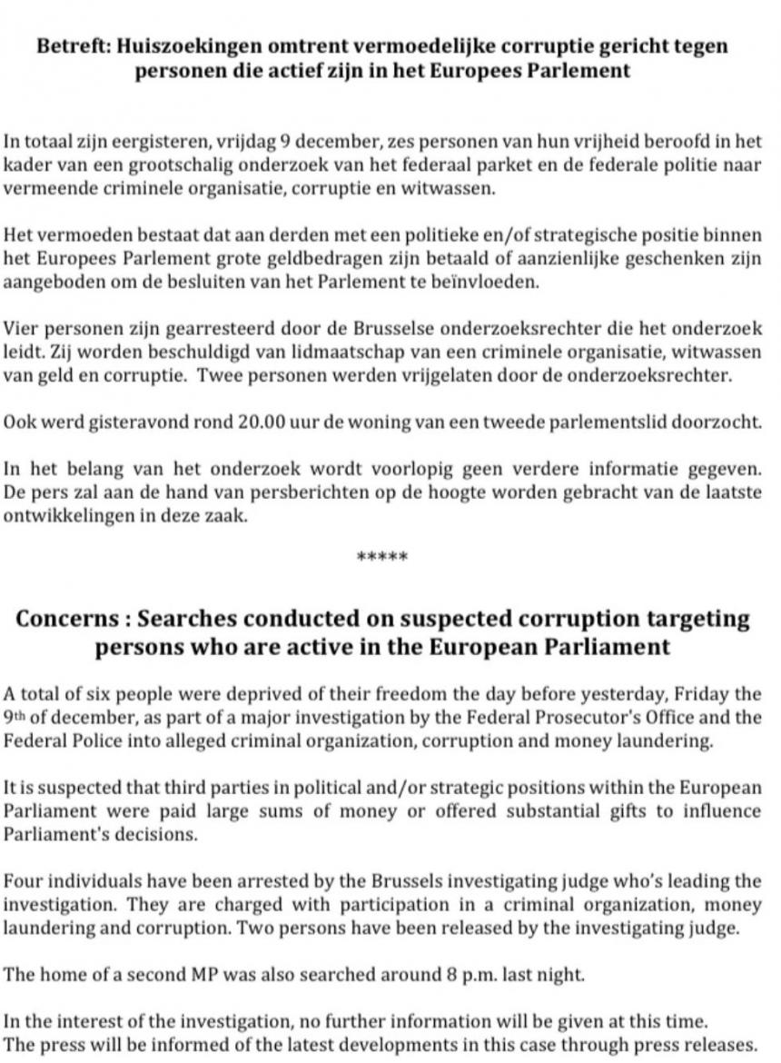 «Εγινε μεγάλη έρευνα απο την Ομοσπονδιακή Εισαγγελία και την Ομοσπονδιακή αστυνομία για φερόμενη εγκληματική οργάνωση, διαφθορά και ξέπλυμα βρώμικου χρήματος. Υπάρχουν υποψίες ότι τρίτα μέρη σε πολιτικές ή και στρατηγικές θέσεις εντός του Ευρωπαϊκού Κοινοβουλίου πληρώθηκαν με μεγάλα χρηματικά ποσά ή τους προσφέρθηκαν σημαντικά δώρα για να επηρεάσουν τις αποφάσεις της Βουλής.