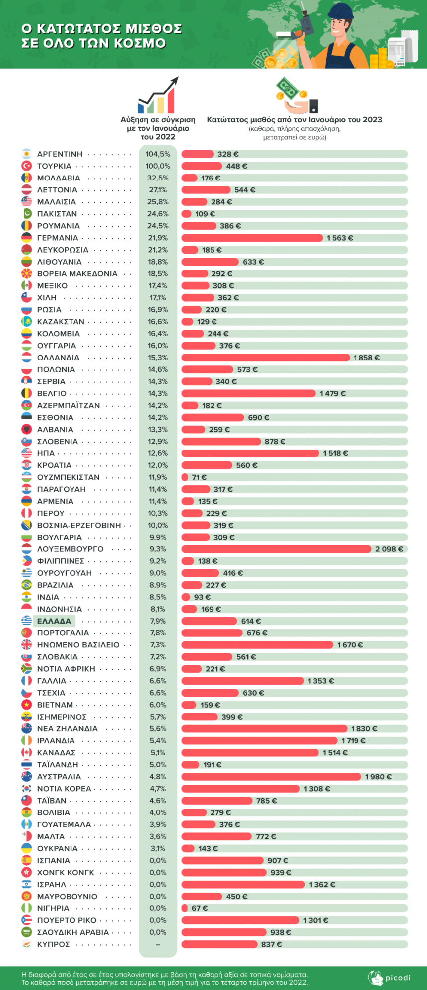 Οι αναλυτές της Picodi.com έλεγξαν πώς άλλαξε ο κατώτατος μισθός το 2023 σε αρκετές δεκάδες χώρες και αν ένας τέτοιος μισθός είναι αρκετός για να εξασφαλίσει ένα ελάχιστο βιοτικό επίπεδο σε αυτές τις χώρες.