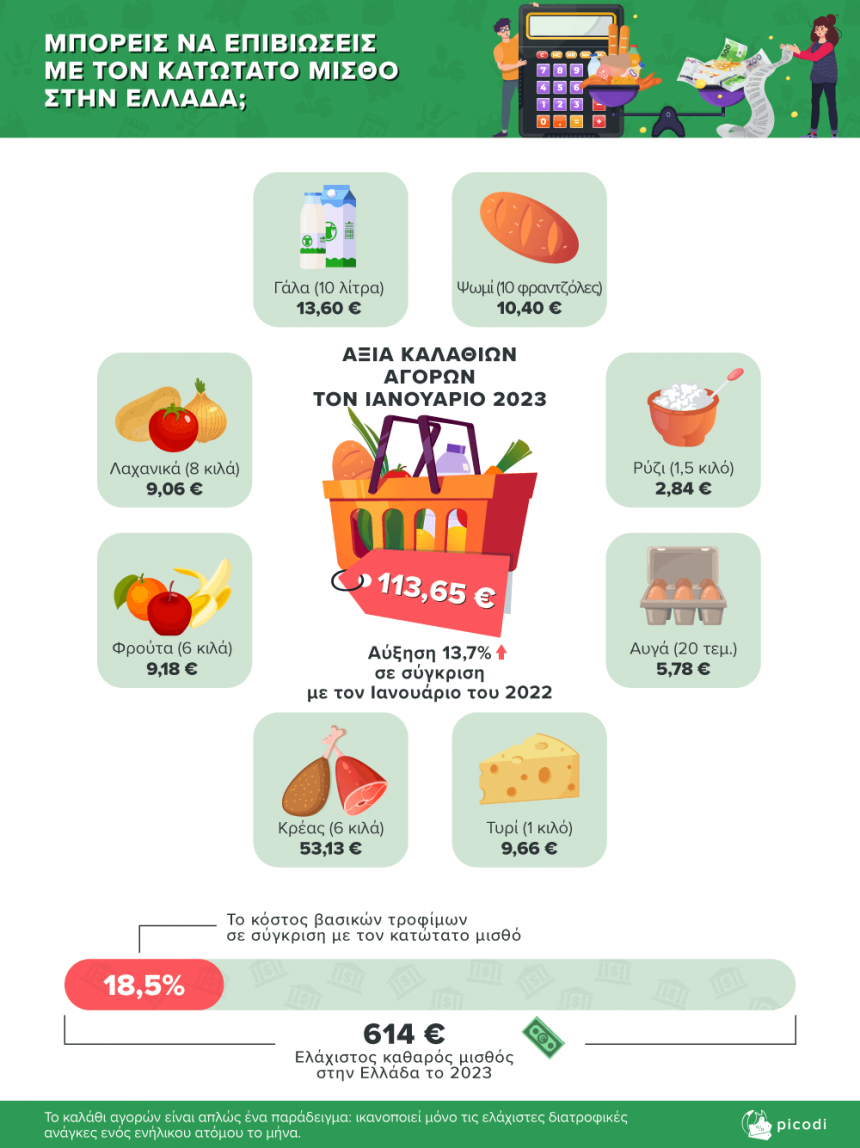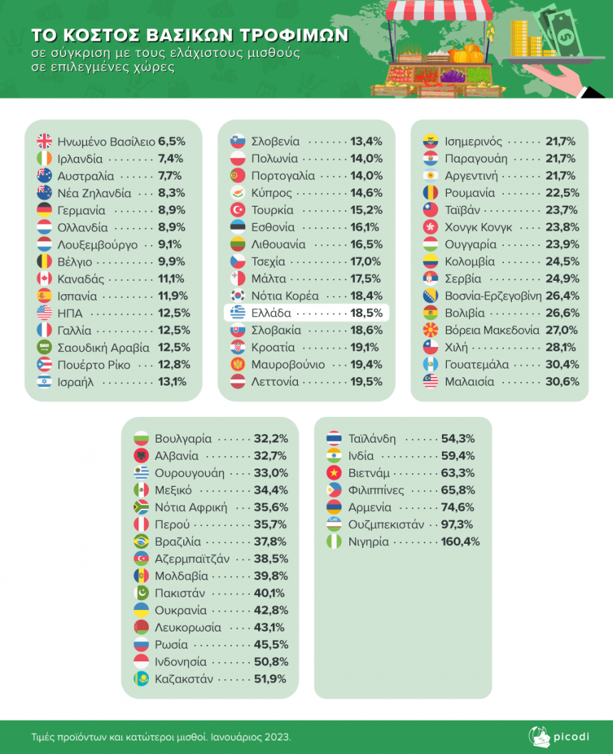Στην Ελλάδα, η τιμή ενός βασικού καλαθιού τροφίμων στις αρχές του 2023 κοστίζει 113,65 ευρώ το οποίο είναι 13,7% υψηλότερο από πέρυσι. Το καλάθι αντιστοιχεί το 18,5% του κατώτατου καθαρού μισθού, σε σύγκριση με το περσινό 17,6% του κατώτατου μισθού. Αυτό σημαίνει ότι οι μισθοί εκείνων που πληρώθηκαν λιγότερο μειώθηκαν ταχύτερα από τις τιμές των τροφίμων.
