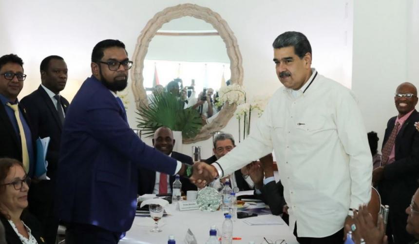 «Η Γουιάνα και η Βενεζουέλα συμφωνούν ότι δεν θα απειλήσουν ούτε θα χρησιμοποιήσουν βία η μια εναντίον της άλλης» και οι διαφορές τους θα επιλυθούν «σύμφωνα με το διεθνές δίκαιο», αναφέρει ανακοίνωση που δημοσιοποιήθηκε μετά τη συνάντηση που είχαν οι πρόεδροι της Γουιάνας Ιρφάν Αλί και της Βενεζουέλας Νικολάς Μαδούρο στον Άγιο Βικέντιο και τις Γρεναδίνες, στην Καραϊβική.