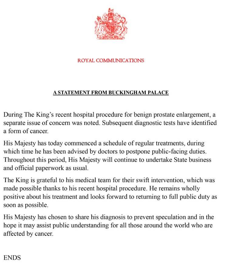 Σύμφωνα με την ανακοίνωση του Παλατιού, η μορφή του καρκίνου δεν έχει αποκαλυφθεί, ωστόσο ο βασιλιάς ξεκίνησε «τακτικές θεραπείες» τη Δευτέρα.