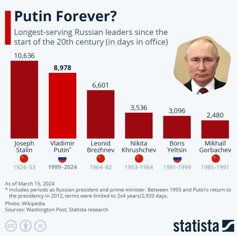 Στην εξουσία για περίπου ένα τέταρτο του αιώνα - με τέσσερις προεδρικές θητείες και δύο θητείες ως πρωθυπουργός μεταξύ 1999 και 2000 και μεταξύ 2008 και 2012 - ο Πούτιν έχει περάσει συνολικά σχεδόν 9.000 ημέρες στο τιμόνι της χώρας. Η νέα εξαετής θητεία που θα ακολουθήσει, διάρκειας περίπου 2.190 ημερών, θα τον καταστήσει πιθανότατα τον μακροβιότερο ηγέτη της Ρωσίας από την αρχή του εικοστού αιώνα. Το ρεκόρ αυτό κατέχει επί του παρόντος ο Ιωσήφ Στάλιν, ο οποίος ηγήθηκε της χώρας μεταξύ 1924 και 1953 για συνολικά 10.636 ημέρες. Ο Πούτιν έγινε ο δεύτερος μακροβιότερος ηγέτης της Ρωσίας ξεπερνώντας τον Μπρέζνιεφ το 2017, στα τέλη της τρίτης θητείας του ως πρόεδρος.