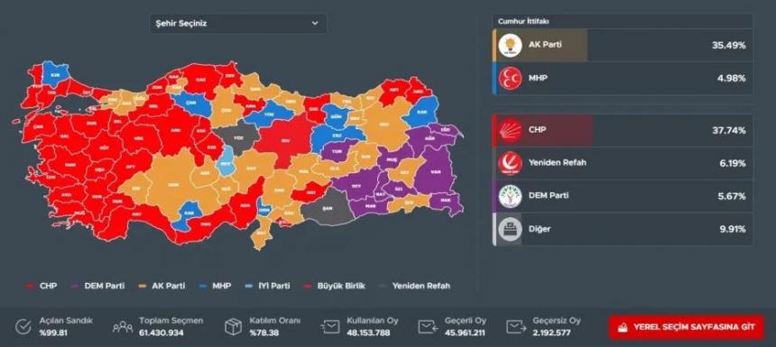 Ειδικότερα, το CHP επικράτησε σε 36 επαρχίες, 15 από τις οποίες ήταν μητροπολιτικές πόλεις. Σε αυτές συμπεριλαμβάνονται περιοχές όπως η Μανίσα, η Προύσα, το Μπαλικεσίρ και το Ντενιζλί στις νικήτριες επαρχίες του, βγήκε με επιτυχία από τις κάλπες στην Αττάλεια, τα Άδανα, τη Μερσίνα, το Αϊδίνιο, το Τεκίρνταγκ και το Εσκισεχίρ.
