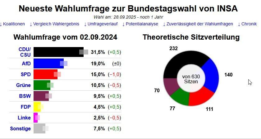 Σύμφωνα με τη σφυγμομέτρηση Insa-Meinungstrend για λογαριασμό της εφημερίδας Bild, την πρώτη μετά τον εκλογικό θρίαμβο της ΑfD στη Θουριγγία και τη Σαξονία της ανατολικής Γερμανίας, η ακροδεξιά αυξάνει κατά μισή ποσοστιαία μονάδα στο 19% τα ποσοστά της στην πρόθεση ψήφου κι είναι αυτή τη στιγμή δεύτερη πίσω από τους Χριστιανοδημοκράτες, που παραμένουν με 31,5% πρώτη δύναμη.
