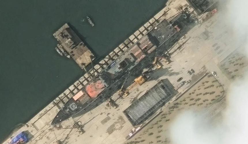 Δορυφορικές εικόνες δείχνουν το πολεμικό πλοίο – καλυμμένο με μπλε μουσαμάδες – να έχει γείρει στο πλάι, με την πρύμνη στραμμένη προς το λιμάνι και την πλώρη να παραμένει στη ράμπα, σύμφωνα το αμερικανικό Κέντρο Στρατηγικών και Διεθνών Σπουδών (CSIS).