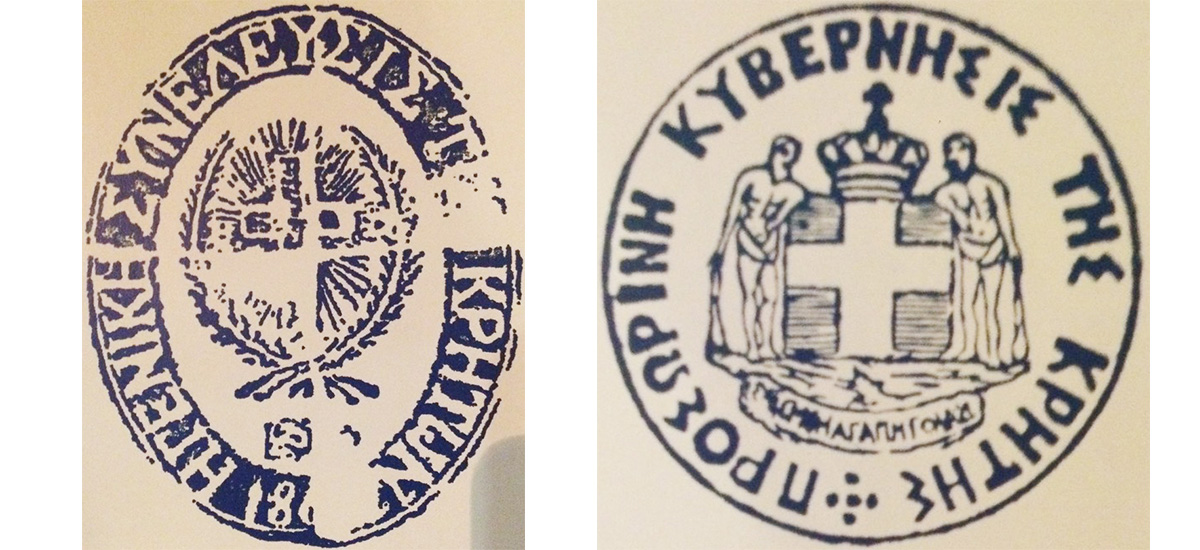 Δεξιά: Η σφραγίδα της συνέλευσης των Κρητών κατά την επανάσταση του 1897