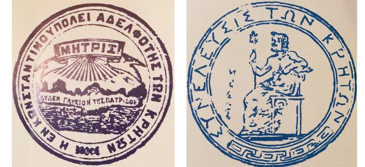 Αριστερά: Σφραγίδα αδελφότητας των Κρητών στην Κωνσταντινούπολη
