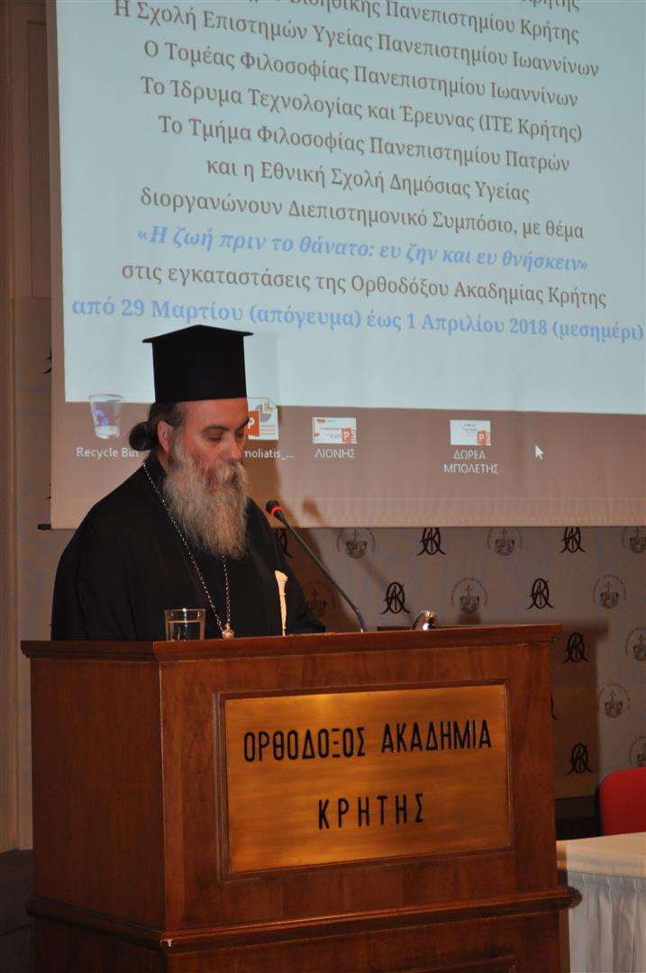 Την Πέμπτη 29 Μαρτίου 2018, πραγματοποιήθηκε η έναρξη των εργασιών του 2ου Διεπιστημονικού Συμποσίου, με θέμα «Η ζωή πριν το θάνατο: ευ ζην και ευ θνήσκειν», το οποίο διοργανώνουν η Ορθόδοξος Ακαδημία Κρήτης (ΟΑΚ), η Σχολή Επιστημών Υγείας Πανεπιστημίου Κρήτης, το Εργαστήριο Βιοηθικής Πανεπιστημίου Κρήτης, η Σχολή Επιστημών Υγείας Πανεπιστημίου Ιωαννίνων, ο Τομέας Φιλοσοφίας Πανεπιστημίου Ιωαννίνων, το Ίδρυμα Τεχνολογίας και Έρευνας (ΙΤΕ Κρήτης), το Τμήμα Φιλοσοφίας Πανεπιστημίου Πατρών και η Εθνική Σχολή Δημόσιας Υγείας.