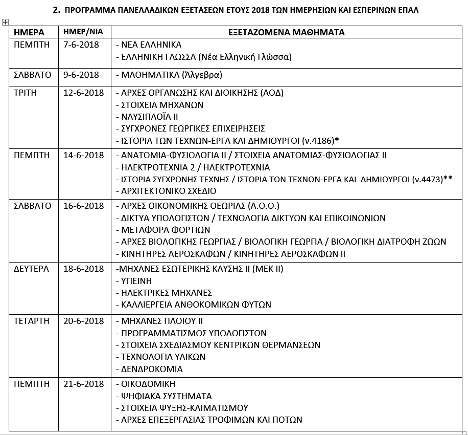 * Την Τρίτη 12-6-2018 στο μάθημα ΙΣΤΟΡΙΑ ΤΩΝ ΤΕΧΝΩΝ-ΕΡΓΑ ΚΑΙ ΔΗΜΙΟΥΡΓΟΙ εξετάζονται  α) οι μαθητές/-τριες της Δ΄ τάξης εσπερινών ΕΠΑ.Λ σχ. έτους 2017-2018   και   β) οι απόφοιτοι/-ες της Δ΄ τάξης εσπερινών ΕΠΑ.Λ. παρελθόντων ετών που διεκδικούν το ειδικό ποσοστό 1% επιπλέον των εισακτέων στην Τριτοβάθμια  Εκπαίδευση (ΜΟΝΟ για ΤΕΙ, ΑΣΠΑΙΤΕ, ΑΣΤΕ, ΑΕΝ).