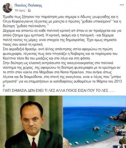 Μετά τον σάλο των προηγούμενων ημερών που προξενήθηκε από κτίριο που βρίσκεται πάνω στη θάλασσα στην παραλία Μαριδάκι στο Ηράκλειο, ο αναπληρωτής υπουργός Υγείας Παύλος Πολάκης με ανάρτησή του σε μέσο κοινωνικής δικτύωσης “δείχνει” την Όλγα Κεφαλογιάννη και την στενή της οικογένεια, όπως την χαρακτηρίζει, η οποία σύμφωνα με τον κο Πολάκη, φέρεται “να “μπήκε μπροστά” για να σταματήσουν οι κατεδαφίσεις αυθαιρέτων το Μάρτιο του 2013″.