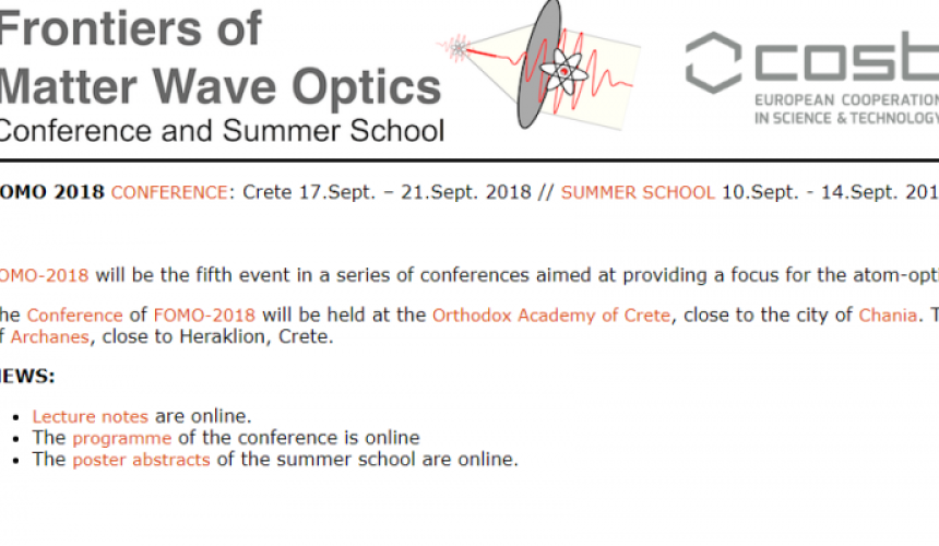 Φέτος οργανώθηκε για τρίτη φορά στην Κρήτη με μεγάλη επιτυχία το Θερινό Σχολείο (Summer School) FOMO (Frontiers of Matter Wave Optics) και στη συνέχεια το Παγκόσμιο Συνέδριο FOMO από τις 10/09 μέχρι τις 14/09 και από τις 17/09 μέχρι τις 21/09 αντίστοιχα.