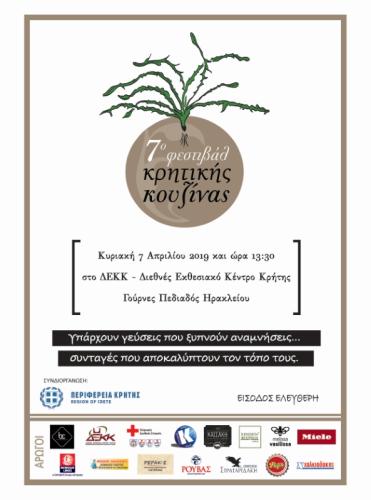 Ο σύλλογος Φεστιβάλ Κρητικής Κουζίνας με τη συνδιοργάνωση της Περιφέρειας Κρήτης, οργανώνει το ετήσιο αντάμωμα των συλλόγων το «7ο Φεστιβάλ Κρητικής Κουζίνας», την Κυριακή 7 Απριλίου 2019 και ώρα 13:30, στο ΔΕΚΚ (Διεθνές Εκθεσιακό Κέντρο Κρήτης, Γούρνες Πεδιάδος Ηρακλείου) με ελεύθερη είσοδο για τους πολίτες.