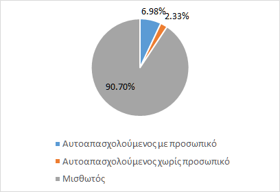 Από το σύνολο των 43 εργαζόμενων, οι 3 είναι αυτοαπασχολούμενοι με προσωπικό, ο ένας είναι αυτοαπασχολούμενος χωρίς προσωπικό και οι 39 μισθωτοί (Διάγραμμα 4).