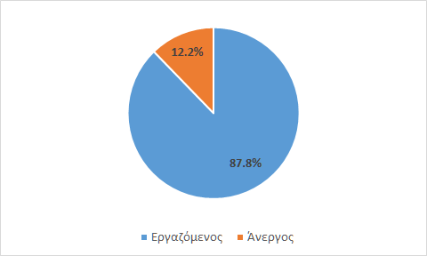 Το ποσοστό απασχόλησης του τμήματος εμφανίζεται ιδιαίτερα υψηλό, και ανέρχεται σε 88%, δηλαδή σχεδόν 9 στους 10 αποφοίτους του Τμήματος εργάζονται. Συγκεκριμένα, από το σύνολο των απαντήσεων που ελήφθησαν προκύπτει ότι οι 43 απόφοιτοι είναι εργαζόμενοι, οι 6 άνεργοι, ενώ 3 απόφοιτοι υπηρετούν στρατιωτική θητεία. Το ποσοστό απασχόλησης υπολογίζεται με την αφαίρεση των υπηρετούντων στρατιωτική θητεία και παρουσιάζεται στο Διάγραμμα 3.