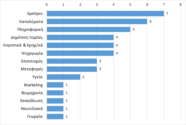 Στο Διάγραμμα 7 παρουσιάζεται η κατανομή των εργαζόμενων αποφοίτων ανά κλάδο απασχόλησης. Παρατηρούμε ότι μεγάλος αριθμός αποφοίτων εργάζεται σε εμπορικές επιχειρήσεις, καταλύματα, αλλά και στον κλάδο πληροφορικής.