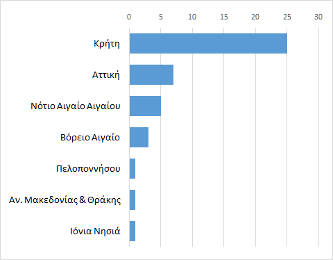 Τέλος, στο διάγραμμα 8 παρουσιάζεται η γεωγραφική κατανομή του τόπου εργασίας των αποφοίτων. Προκύπτει ότι το 58,1% των αποφοίτων εργάζεται στην περιφέρεια Κρήτης, το 16,3% στην Περιφέρεια Αττικής, ενώ το 20,9% εργάζεται σε νησιωτική περιφέρεια (Βόρειο και Νότιο Αιγαίο και Ιόνια Νησιά)
