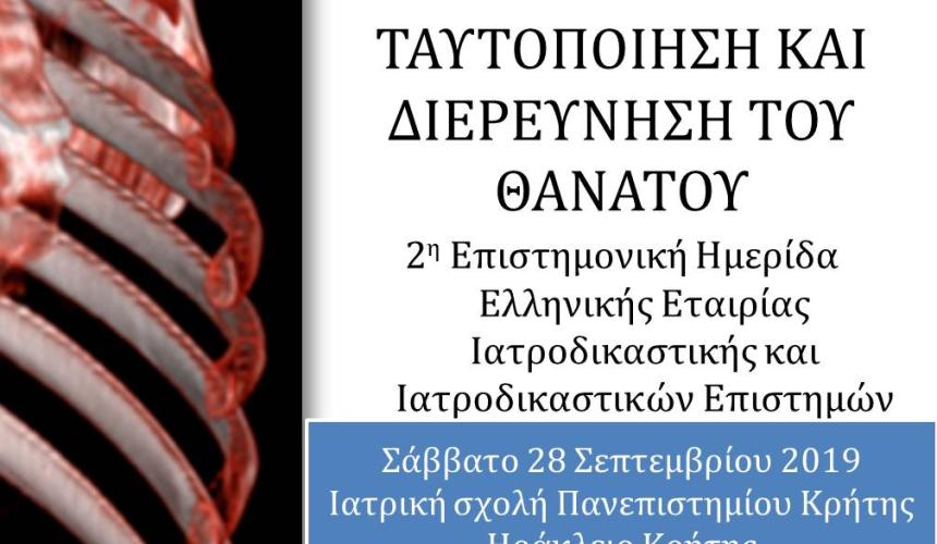 Το Εργαστήριο Ιατροδικαστικών Επιστημών του Πανεπιστημίου Κρήτης σε συνεργασία με η την Ιατροδικαστική Υπηρεσία Κρήτης, την Ελληνική Εταιρία Ιατροδικαστικής και Ιατροδικαστικών Επιστημών (ΕΕΙΙΕ), και την Περιφέρεια Κρήτης οργανώνει τη 2η Επιστημονική Ημερίδα Ιατροδικαστικής που θα πραγματοποιηθεί το Σάββατο 28 Σεπτεμβρίου 2019 στην Ιατρική Σχολή του Πανεπιστημίου Κρήτης.