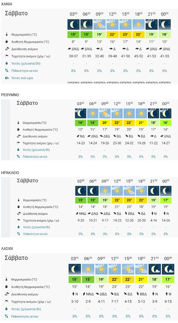 Βροχές και σποραδικές καταιγίδες τις θερμές ώρες της ημέρας κυρίως στην Κεντρική και Βόρεια Ελλάδα. Πιθανότητα χαλαζοπτώσεων στη Θράκη. Περιορισμένη τοπικά ορατότητα τις πρωινές και νυκτερινές ώρες. Άνεμοι δυτικών κυρίως διευθύνσεων με εντάσεις έως 6 μποφόρ.