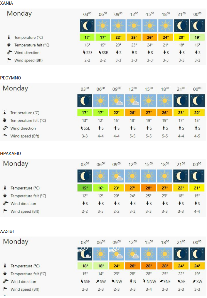 Ηλιοφάνεια με αραιές νεφώσεις βαθμιαία πυκνότερες στα ηπειρωτικά, τοπικά περιορισμένη ορατότητα τις βραδινές και πρώτες πρωινές ώρες, μέτριοι και τοπικά ισχυροί νότιοι άνεμοι, σταδιακά αυξημένες συγκεντρώσεις σκόνης στην ατμόσφαιρα, θερμοκρασία σε άνοδο.
