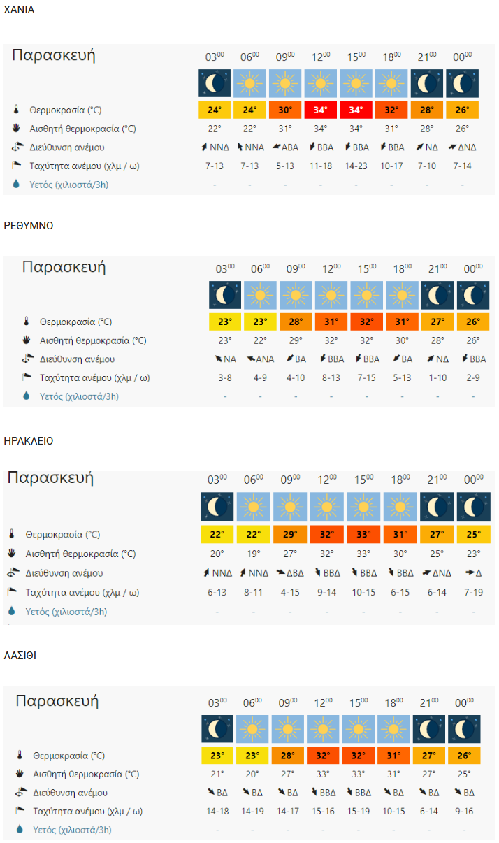 Η θερμοκρασία στα βόρεια ηπειρωτικά θα κυμανθεί από 14 έως 33 βαθμούς, στα υπόλοιπα ηπειρωτικά από 17 έως 40, στα νησιά του Ιονίου από 16 έως 33, στα νησιά του Βορείου Αιγαίου από 14 έως 35, στα Δωδεκάνησα και στα νησιά του Ανατολικού Αιγαίου από 18 έως 34, στα νησιά του υπολοίπου Αιγαίου από 12 έως 31 και στην Κρήτη από 18 έως 38 βαθμούς.