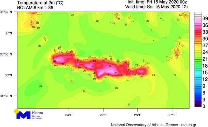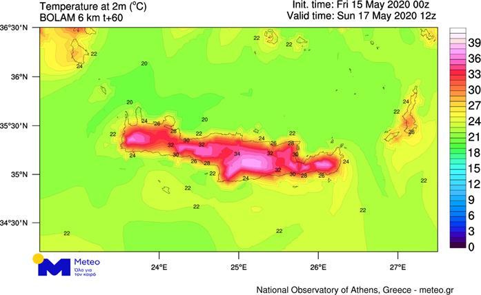 Σε υψηλά επίπεδα θα διατηρηθεί η θερμοκρασία τις επόμενες ημέρες στην Κρήτη. Όπως διακρίνεται και στους 2 παρακάτω χάρτες, για το μεσημέρι του Σαββάτου 16/05 και της Κυριακής 17/05, η θερμοκρασία αναμένεται να ξεπεράσει σε αρκετές περιοχές (κυρίως στο εσωτερικό του νησιού) τους 37-38 βαθμούς, ενώ τοπικά μπορεί να προσεγγίσει και τους 40 βαθμούς. Οι αναμενόμενες αυτές θερμοκρασίες είναι 12 ως 14 βαθμούς υψηλότερες από τις κανονικές τιμές του Μαΐου.