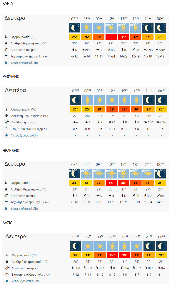 Η θερμοκρασία στα βόρεια ηπειρωτικά θα κυμανθεί από 15 έως 32 βαθμούς, στα κεντρικά ηπειρωτικά από 16 έως 36, στα νότια ηπειρωτικά από 17 έως 38, στα νησιά του Ιονίου από 19 έως 33, στα νησιά του Ανατολικού Αιγαίου από 18 έως 35, στα Δωδεκάνησα από 21 έως 38, στην Κρήτη από 18 έως 38 και στα νησιά του υπολοίπου Αιγαίου από 15 έως 31 βαθμούς.
