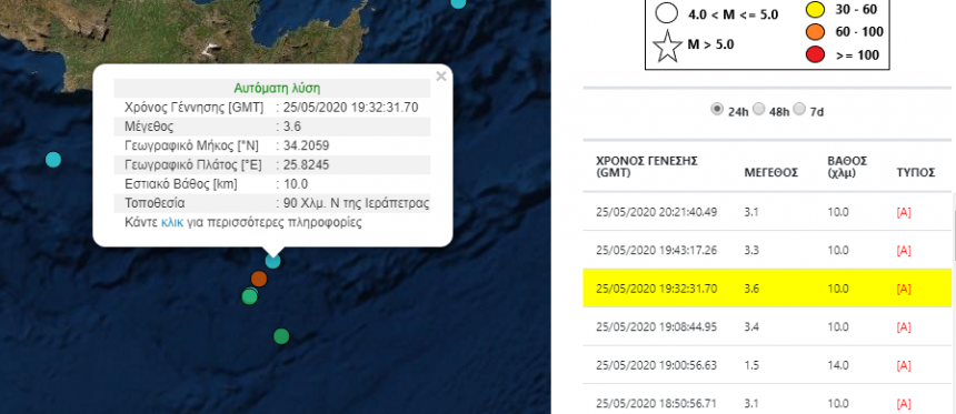 Σύμφωνα με το Γεωδυναμικό Ινστιτούτο της Αθήνας στις 10:32 το βράδυ της Δευτέρας καταγράφηκε σεισμός μεγέθους 3,6 Ρίχτερ, με το επίκεντρό του να εντοπίζεται στη θάλασσα σε απόσταση 90 χιλιομέτρων νότια της Ιεράπετρας. Το εστιακό του βάθος υπολογίστηκε στα 10 χιλιόμετρα.