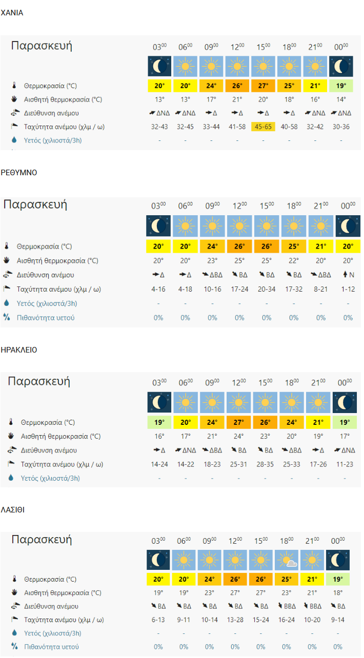 Η θερμοκρασία θα κυμανθεί από 16 έως 29 βαθμούς στη Βόρεια Ελλάδα (στη Δυτική Μακεδονία από 11 έως 23 βαθμούς), 18 έως 29 βαθμούς στην Κεντρική και Νότια Ελλάδα (στη Θεσσαλία έως τους 31 βαθμούς), 15 έως 25 βαθμούς στη Δυτική Ελλάδα (στη Νοτιοδυτική Πελοπόννησο έως τους 28 βαθμούς), 19 έως 26 βαθμούς στις Κυκλάδες και 17 έως 28 βαθμούς στην Κρήτη, 19 έως 28 βαθμούς στα νησιά του Ανατολικού Αιγαίου και στα Δωδεκάνησα.