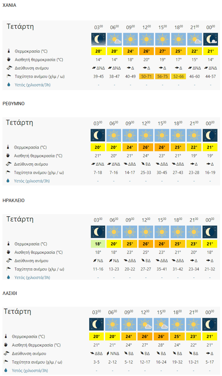 Η θερμοκρασία στη Δυτική Μακεδονία θα κυμανθεί από 12 έως 25 βαθμούς, στην υπόλοιπη Μακεδονία και στη Θράκη από 16 έως 29, στην Θεσσαλία από 19 έως 32, στην Ήπειρο από 17 έως 26, στα υπόλοιπα ηπειρωτικά από 17 έως 30, στα νησιά του Ιονίου από 19 έως 25, στα νησιά του Αιγαίου από 19 έως 30 και στην Κρήτη από 15 έως 30.