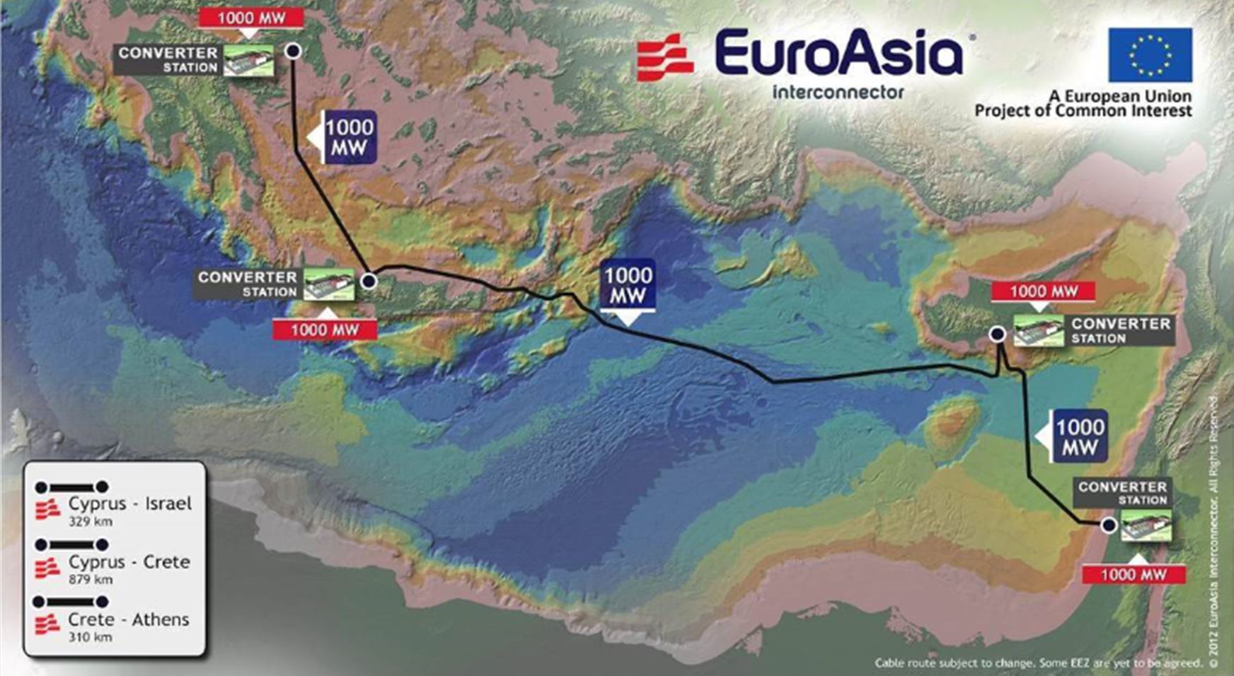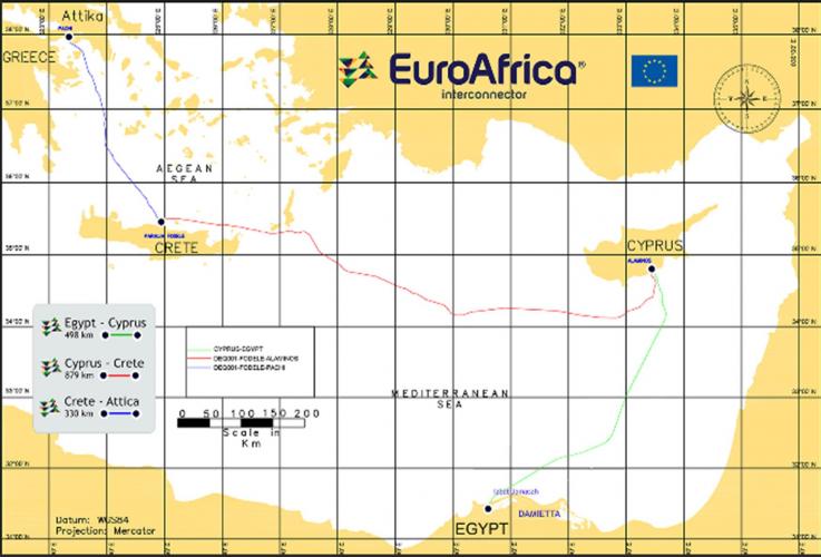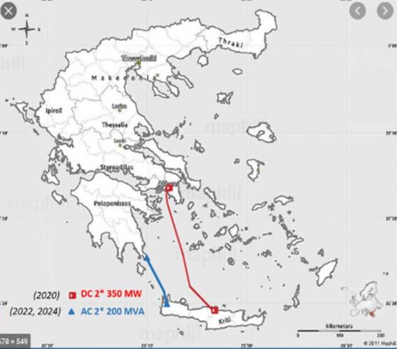 Ο υπουργός ΠΕΝ κύριος Χατζηδάκης μαζί με τον κύριο Θωμά κατέβηκαν στην Κρήτη και υπέγραψαν την σύμβαση διασύνδεσης της Κρήτης με 2 καλώδια για την μεταφορά ενέργειας 550MWαπό την Πελοπόννησο και την Αττική, εικόνα 2. Το ρεύμα θα παράγεται από ΑΗΣ που λειτουργούν, φυσικά με Ρωσικό, αέριο. Τα 550 MWμαζ΄ί με τον σταθμό της ΔΕΗ στην Ξυλοκαμάρα των Χανίων ισχύος 120 MWπου λειτουργεί με φυσικό αέριο είναι ικανά να καλύψουν τις ανάγκες της Κρήτης. Επίσης στην Κρήτη υπάρχουν ανεμογεννήτριες ισχύος 220MW φωτοβολταικά ισχυος 78.29 MWσε πάρκα και 1.78MWσε στέγες σπιτιών. Επιπροσθέτωςσε κάποιο μέρος της Κρήτης κατασκευάζεται και ένα ηλιοθερμικό εργοστάσιο παραγωγής ηλεκτρικής ενέργειας από την ομάδα NUR- MOTOROIL, ισχύος 50 MW. Επίσης στο Ηράκλειο καταλήγει και το καλώδιο μεταφοράς ηλεκτρικού ρεύματος, Euro-AsiaInterconnector, ισχύος 1000 MW ,που παράγεται πάλι από φυσικό αέριο του Ισραήλ, εικόνα 3. Και όχι μόνο, από την Αίγυπτο έρχεται και άλλο ένα καλώδιο, Euro-AfricaInterconnector,που θα μεταφέρει 2000 MWαπό την Αίγυπτο μέσω Κρήτης προς Ευρώπη, εικόνα 4. Ενημερωτικά η αιχμή του φορτίου της Κρήτης είναι περίπου τα 650MW τους θερινούς μήνες.Και έρχεται η ΒΟΜΒΑ από τον αναπληρωτή υπουργό ΠΕΝ κύριο Θωμά δύο ημέρες μετά την σύμβαση της υπογραφής με την SIEMENSγια την μεταφορά ρεύματος από την χερσαία Ελλάδα προς την Κρήτη. Λέει λοιπόν ο κύριος Θωμάς ότι στην Κρήτη μπορούν να εγκατασταθούν και άλλες 2500 MW. Η πρώτη σκέψη είναι, ότι αν λειτουργήσουν οι ανεμογεννήτριες των 2500 ΜW, των οποίων η επένδυση θα στοιχίσει τουλάχιστον 5 δις ευρώ, τότε η Κρήτη γίνεται μπαταρία της Ελλάδας. Μας λέει όμως ο ΑΔΜΗΕ ότι οι επιδοτούμενες ανεμογεννήτριες, αν εγκατασταθούν, καίτοι θα έχουν ισχύ 2500 MWη απόδοσή τους θα είναι πολύ ποιο κάτω του 3%. Να γιατί βάζουμε την σύνδεση με την Πελοπόννησο και την Αττική που θα μας παρέχει ρεύμα από το εισαγόμενο Ρωσικό φυσικό αέριο. Έχουμε το παράδειγμα της 8ης Ιουνίου. Νομίζω ότι το αναγνωστικό κοινό καταλαβαίνει γιατί επιθυμεί ο κύριος Θωμάς να μπούνε οι επι πλέον ανεμογεννήτριες. Ναι δεν μπορούμε να χρηματοδοτήσουμε την αγορά ενός αντιτορπιλικού αλλά υπάρχουν 5 δις ευρώ για να εγκατασταθούν στην Κρήτη άχρηστες ανεμογεννήτριες ισχύος 2500 MW Δεν γνωρίζω τι προέχει σε αυτό το κράτος. Η διαφύλαξη της Εθνικής μας ανεξαρτησίας η η αγορά των επιδοτούμενων γερμανικών ανεμογεννητριών