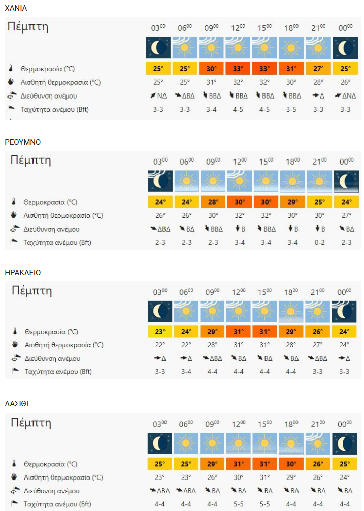 ΚΡΗΤΗ 02.07.2020 07:30Ο καιρός στην Κρήτη σήμερα Πέμπτη 2 Ιουλίου Ρέθεμνος Newsroom Facebook Twitter Copy link 0 Ζέστη και τοπικές βροχές στα ορεινά ηπειρωτικά αναμένονται την Πέμπτη 2 Ιουλίου 2020. Η θερμοκρασία δεν θα παρουσιάσει αξιόλογη μεταβολή. Έως 6 μποφόρ στα πελάγη. meteoblue.gr 0 Facebook Twitter Copy link καιρός ΣΧΕΤΙΚΑ ΑΡΘΡΑ Κρήτη 27.11.2025 19:33Έντονη Μετεωρολογική Προειδοποίηση για την Κρήτη: «Μια πολύ επικίνδυνη κατάσταση περιφέρεται γύρω από το νησί» προειδοποιεί ο Ζαχαρής Βάρδας Κρήτη 18.08.2020 08:00Κρήτη: Πολύ υψηλός ο κίνδυνος πυρκαγιάς σήμερα Κρήτη 04.08.2020 07:30Ο καιρός στην Κρήτη σήμερα Τρίτη 4 Αυγούστου Κρήτη 02.08.2020 19:30Yψηλές θερμοκρασίες και την Κυριακή στην Κρήτη