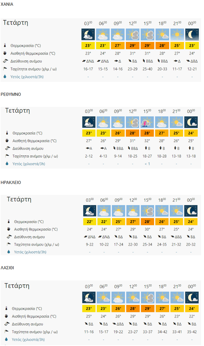 Η θερμοκρασία θα κυμανθεί στη Δυτική Μακεδονία από 10 έως 29 βαθμούς, στην υπόλοιπη Βόρεια Ελλάδα από 12 έως 33 βαθμούς, στην Ήπειρο και στη Θεσσαλία από 16 έως 34 βαθμούς, στα δυτικά ηπειρωτικά και στη Νότια Πελοπόννησο από 16 έως 33 βαθμούς, στα υπόλοιπα ανατολικά ηπειρωτικά από 17 έως 34 βαθμούς, στα νησιά του Ιονίου από 18 έως 32 βαθμούς, και στα νησιά του Αιγαίου από 17 έως 34 βαθμούς αλλά στις Σποράδες, στις Κυκλάδες και στη Βόρεια Κρήτη οι μέγιστες δε θα ξεπεράσουν τους 30 βαθμούς Κελσίου.