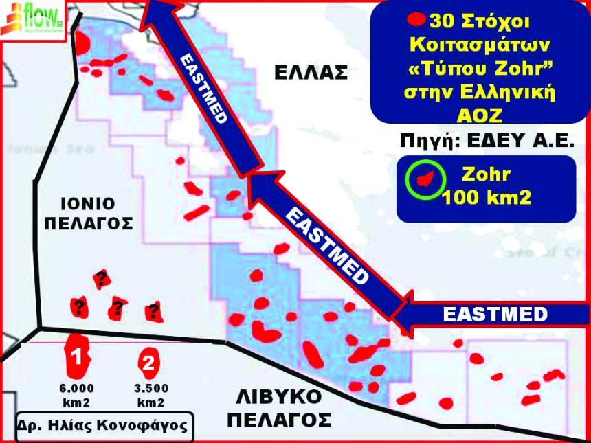 Στην Εικ.3, παρατηρούμε ότι υπάρχουν ήδη χαρτογραφημένοι 30 ασβεστολιθικοί στόχοι κοιτασμάτων "τύπου Zohr" οι περισσότερο των οποίων είναι μεγαλύτεροι σε μέγεθος από το ίδιο το κοίτασμα "Ζohr" (κοίτασμα 'Zohr" σε πράσινο κύκλο χαρτογραφημένο στην ίδια κλίμακα με τους άλλους στόχους κοιτασμάτων με κόκκινο χρώμα).