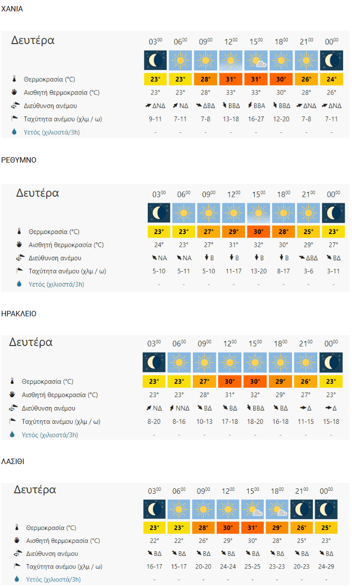 Η θερμοκρασία θα κυμανθεί από 18 έως 33 βαθμούς στη Βόρεια Ελλάδα (στη Δυτική Μακεδονία από 15 έως 27 βαθμούς), 20 έως 34 βαθμούς στην Κεντρική και Νότια Ελλάδα, 18 έως 32 βαθμούς στη Δυτική Ελλάδα, 19 έως 33 βαθμούς στις Κυκλάδες και στην Κρήτη, 20 έως 34 βαθμούς στα νησιά του Ανατολικού Αιγαίου και στα Δωδεκάνησα.