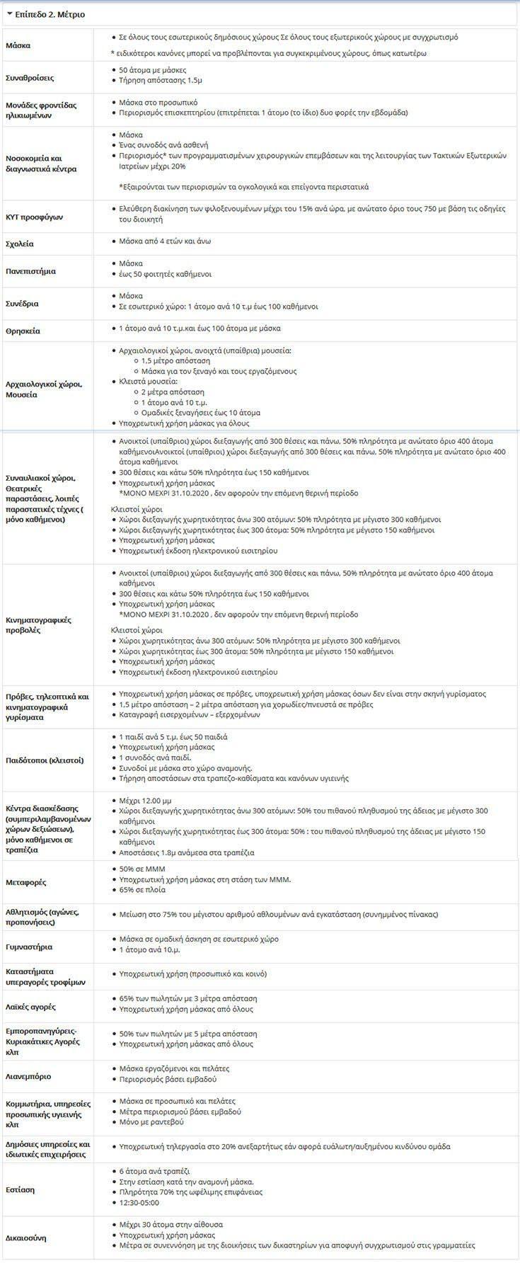 Πατώντας πάνω στον χαρακτηρισμό του κάθε επιπέδου θα εμφανιστούν οι 26 κατηγορίες και τα μέτρα που βρίσκονται σε ισχύ.