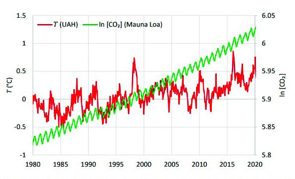 Εικόνα 2. Τεσσαρακονταετής συσχετισμός μέσης γήινης θερμοκρασίας με την αύξηση της συγκέντρωσης του παραμένοντος στην ατμόσφαιρα CO2….ΚΑΜΜΙΑ ΣΧΕΣΗ, Κουτσογιαννης 2019