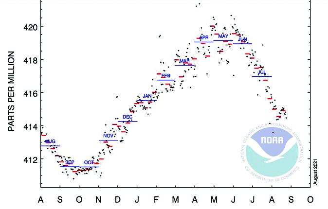 Εικόνα 3. Ετήσιο σκαμπανέβασμα του ατμοσφαιρικούCO2 από 410 ppm (Οκτώβριος) έως 422 ppm (Ιούνιος) πουμεταφράζεται σε μία αυξομείωση του ατμοσφαιρικού CO2 της τάξης των 98δις όταν οι ετήσιες εκπομπές των υδρογονανθράκων ανέρχονται ΜΟΝΟ 38 ΔΙΣ Μ3 ΕΤΗΣΙΩΣ...άρα, υπάρχουν και άλλες πηγές που εκλύουν ετησίως τα υπόλοιπα 60 δις Μ3 CO2 .