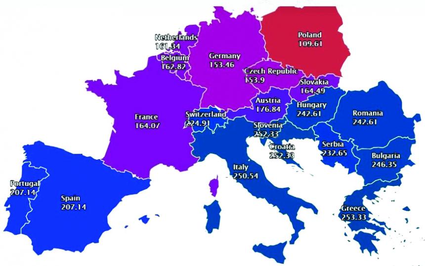 Εικόνα 4. Εκτόξευση του κόστους της κιλοβατώρας σε ευρώ, πλην Πολωνίας και Γερμανίας που ακόμη χρησιμοποιούν λιγνίτη, 150 εκατομμύρια τόνους έκαστη, για ηλεκτροπαραγωγή
