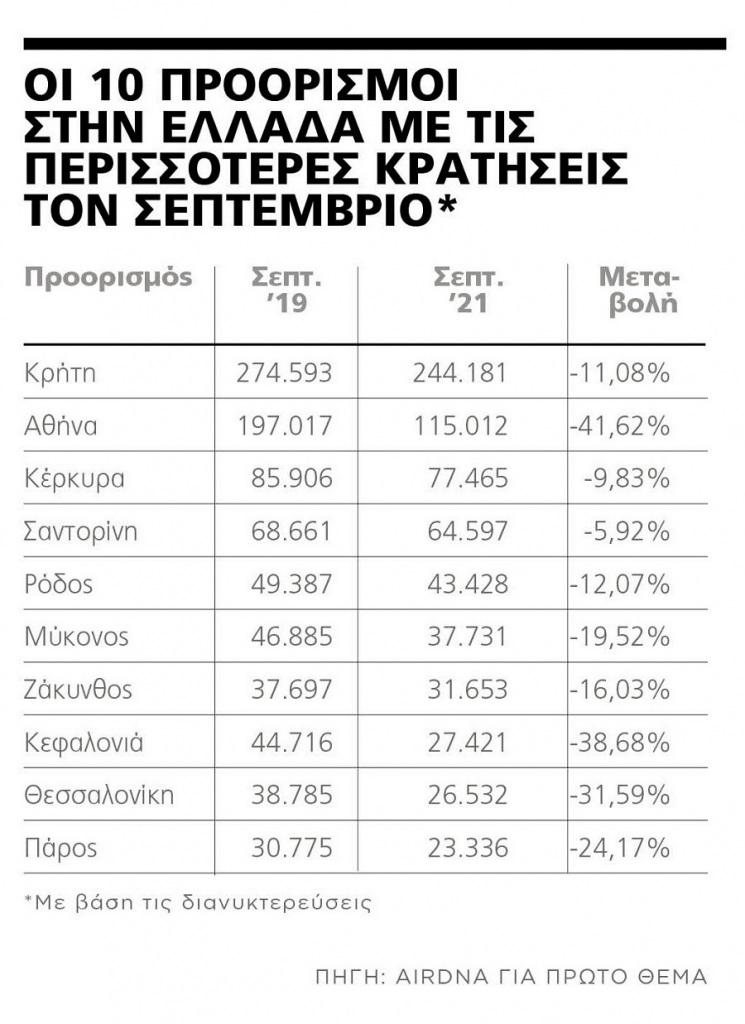 ■ Ως προς τις κρατήσεις από τους επισκέπτες φέτος τον Αύγουστο, με βάση τον αριθμό των διανυκτερεύσεων, εμφανίζονται μειωμένες κατά 23% σε σύγκριση με τον Αύγουστο προ κορωνοϊού, στο 1,48 εκατομμύριο πανελλαδικά, ενώ τον Σεπτέμβριο, με λίγο πιο πάνω από το 1 εκατομμύριο, κινήθηκαν πτωτικά σε ποσοστό 28%.