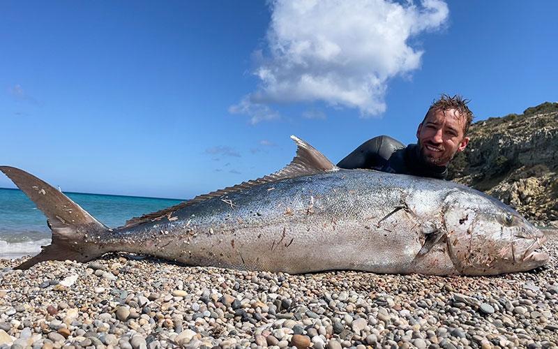 Καθώς πλησιάζαμε την παραλία, η οικογένειά μου, που παρακολουθούσε από την ακτή, είδε τη μεγάλη ράχη να βγαίνει από τη θάλασσα και την ουρά να ταράζει την επιφάνεια. Νόμιζαν ότι ένας καρχαρίας με ακολουθούσε! Σαράντα λεπτά μετά την βολή, φτάσαμε επιτέλους στην παραλία. Έχοντας το ψάρι πλέον πολύ κουρασμένο και ίσα που κολυμπούσε, προσπάθησα να αρπάξω την ουρά, αλλά το χέρι μου μπόρεσε να πιάσει κάτι λιγότερο από το μισό της περιφέρειάς της.