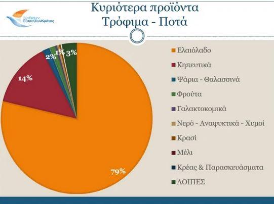 Στον αγροδιατροφικό τομέα, το ελαιόλαδο έφτασε τα 338,5 εκατ. ευρώ, καταλαμβάνοντας το 58,4% του συνόλου των κρητικών εξαγόμενων προϊόντων και το 78,8% στην κατηγορία των Τροφίμων & Ποτών, με αύξηση 208% σε αξία και 142% σε ποσότητα, σε σχέση με το περυσινό αντίστοιχο διάστημα. Τα κηπευτικά έφτασαν τα 59,8 εκατ. ευρώ με αύξηση 25,4%, τα ψάρια & θαλασσινά τα 6,7 εκατ. ευρώ και αύξηση 86,1%, τα φρούτα τα 5,3 εκατ. ευρώ και αύξηση 47,2% και με μικρότερα ποσοστά ακολουθούν τα γαλακτοκομικά, η κατηγορία των νερών- αναψυκτικών- χυμών, το κρασί, το μέλι και το κρέας & παρασκευάσματά του.