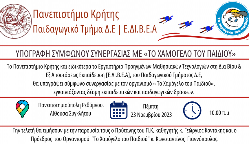 Το Πανεπιστημιο Κρήτης και ειδικότερα το Εργαστήριο Προηγμένων Μαθησιακών Τεχνολογιών στη Δια Βίου & Εξ Αποστάσεως Εκπαίδευση [Ε.ΔΙ.Β.Ε.Α], του Παιδαγωγικού Τμήματος Δ.Ε, θα υπογράψει σύμφωνο συνεργασίας με τον οργανισμό « Το Χαμόγελο του Παιδιού», εγκαινιάζοντας δέσμη εκπαιδευτικών και παιδαγωγικών δράσεων.