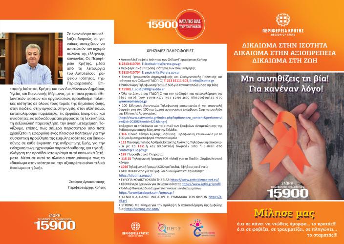 Υλοποιούμε τα τελευταία τέσσερα χρόνια την εκστρατεία, σε συμπόρευση με τον Οργανισμό Ηνωμένων Εθνών, «16 Ημέρες Δράσης για την Πρόληψη και την Αντιμετώπιση της Βίας κατά των γυναικών: Βάφουμε τον Κόσμο Πορτοκαλί. Ενώνουμε Δυνάμεις-Τερματίζουμε τη Βία», σε συνεργασία με τους φορείς της τοπικής αυτοδιοίκησης, τις δομές του Δικτύου της Γενικής Γραμματείας Ισότητας και Ανθρωπίνων Δικαιωμάτων και γυναικείες οργανώσεις και συλλογικότητες. Επίσης, στο πλαίσιο του στρατηγικού μας σχεδιασμού για τη βιώσιμη ανάπτυξη και την κοινωνική ευημερία και πρόοδο σχεδιάσαμε και υλοποιούμε το «Περιφερειακό Σχέδιο Δράσης Κρήτης για την Ισότητα των Φύλων 2023-2025».