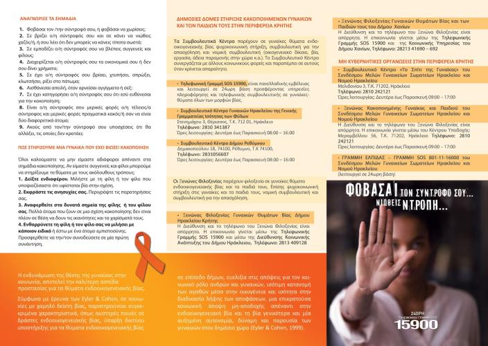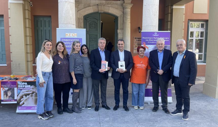 Με μεγάλη ανταπόκριση εκ μέρους των πολιτών πραγματοποιήθηκε, σήμερα Πέμπτη, 24 Νοεμβρίου, από τις 10:00 το πρωί έως τις 2:00 το μεσημέρι, από την Περιφέρεια Κρήτης, το Αυτοτελές Γραφείο Ισότητας και την Περιφερειακή Επιτροπή Ισότητας των Φύλων Κρήτης (Π.ΕΠ.ΙΣ.) ο σταθμός ενημέρωσης και ευαισθητοποίησης για τα θέματα της πρόληψης της έμφυλης βίας και προώθησης της ισότητας των φύλων μπροστά από το Κεντρικό Κτίριο της Περιφέρειας Κρήτης στη πλ. Ελευθερίας. Στο σταθμό συμμετείχαν, παρουσία του Περιφερειάρχη Κρήτης, Σταύρου Αρναουτάκη, τα στελέχη του Συμβουλευτικού Κέντρου Ηρακλείου του Κέντρου Ερευνών για Θέματα Ισότητας (ΚΕΘΙ), του Ξενώνα Φιλοξενίας Γυναικών του Δήμου Ηρακλείου, του Χαμόγελου του Παιδιού, του Γραφείου Αντιμετώπισης Ενδοοικογενειακής Βίας της Αστυνομικής Διεύθυνσης Ηρακλείου και του Συνδέσμου Μελών Γυναικείων Σωματείων Ηρακλείου & Ν. Ηρακλείου.